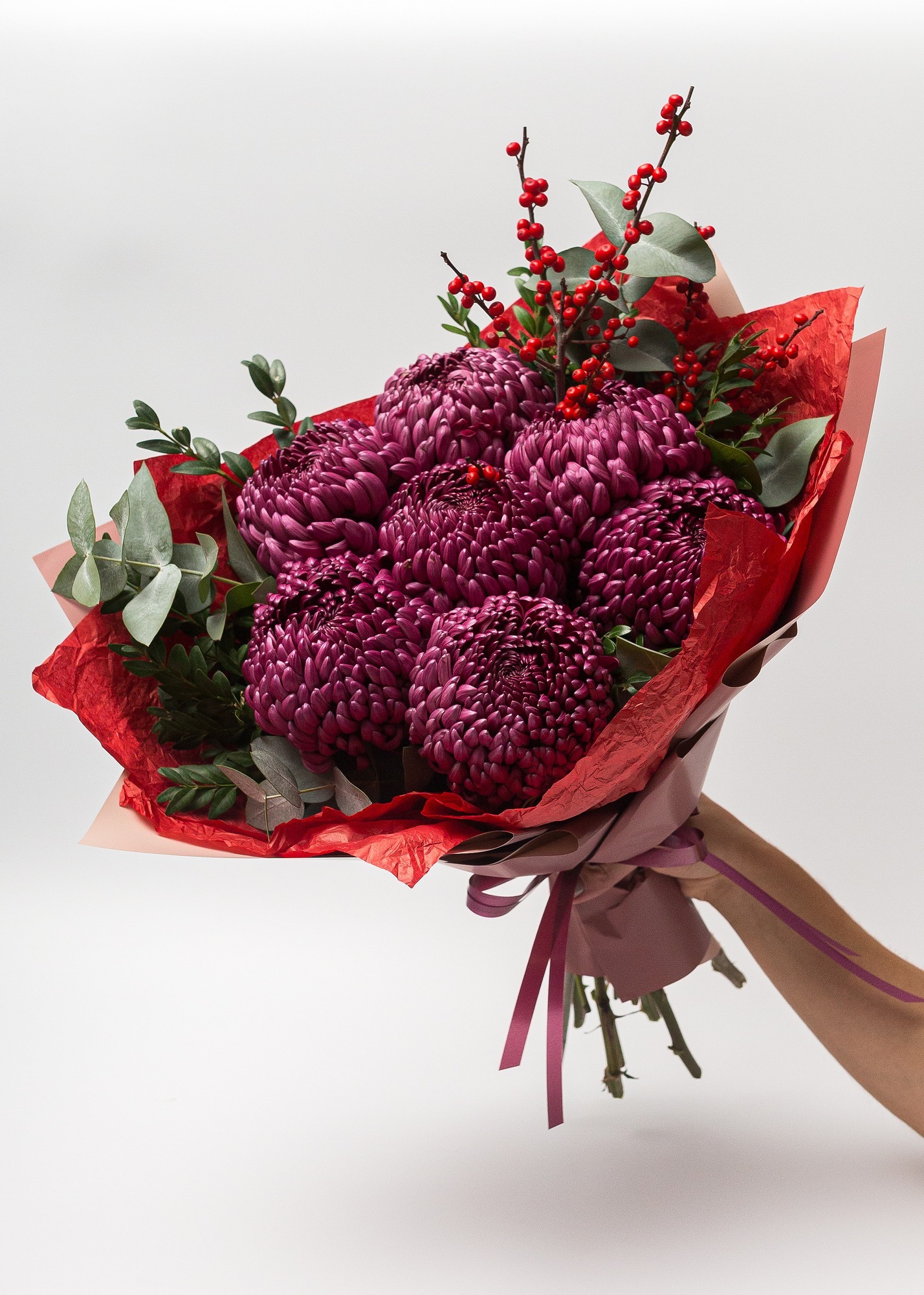 Букет из хризантемы Бигуди — это гармоничное сочетание объёмных соцветий и ярких декоративных деталей. Такой подарок выглядит стильно и элегантно, создавая праздничное настроение с первого взгляда.