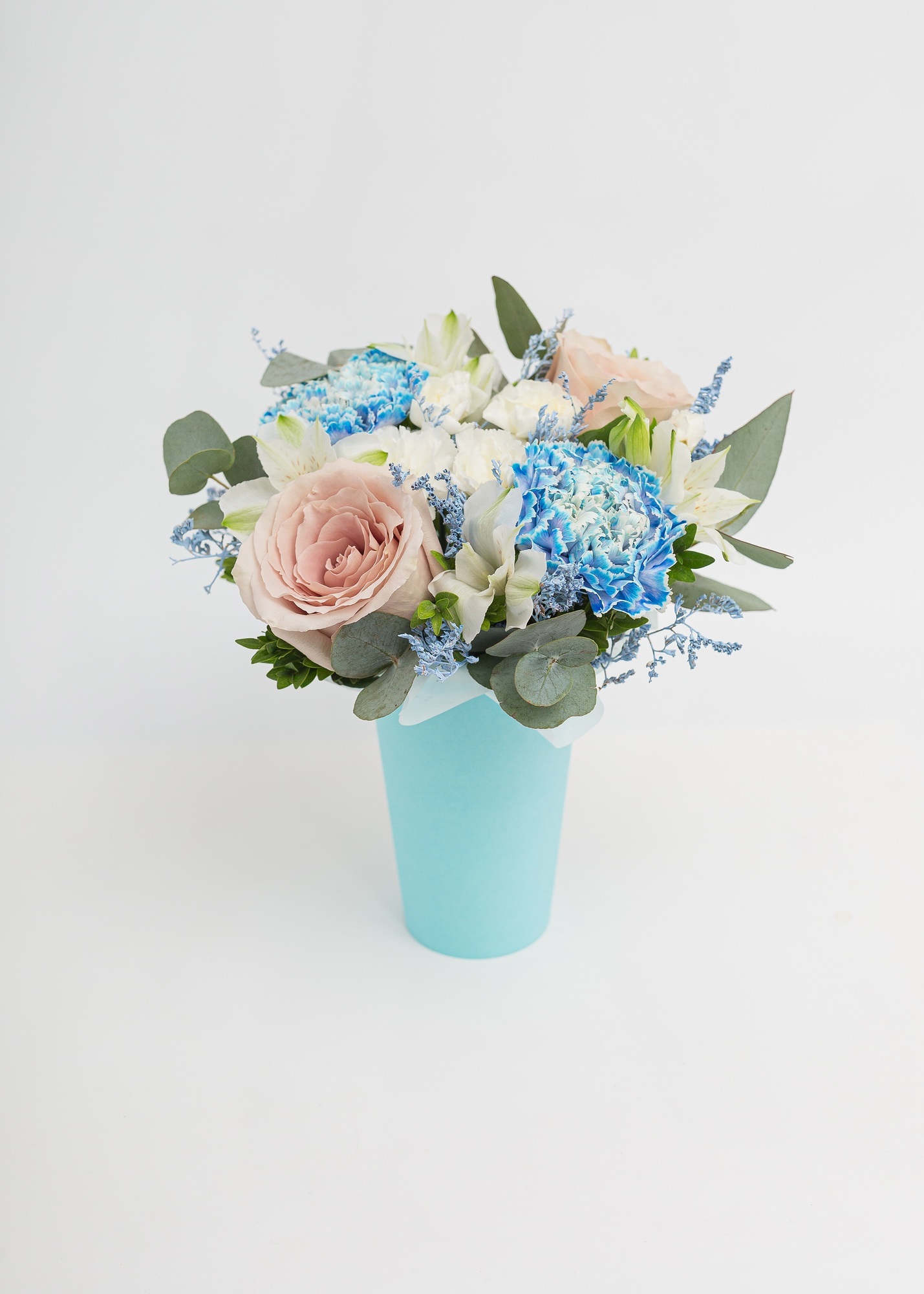 Стаканчик S1 #4 в голубой и кофейной гамме | Роза, гвоздики, альстромерия, лимониум — Дон Пион