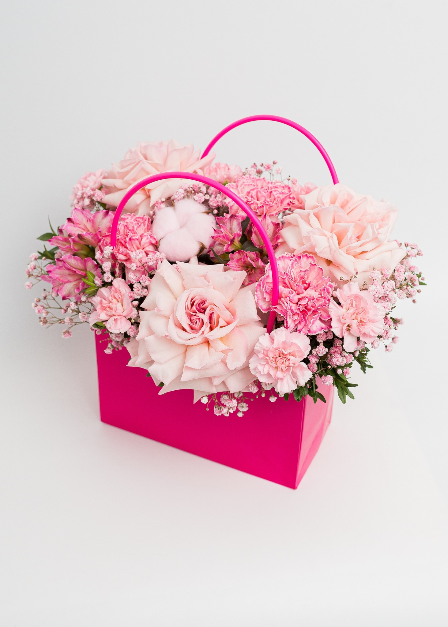 Композиция «Сумочка M1 #3» в розовой гамме создана для того, чтобы дарить радость и лёгкость. Белые розы подчёркивают изящество, а розовые оттенки гвоздик и гипсофилы создают мягкое романтичное настроение. Удобная форма сумочки превращает композицию в стильный и самодостаточный подарок.